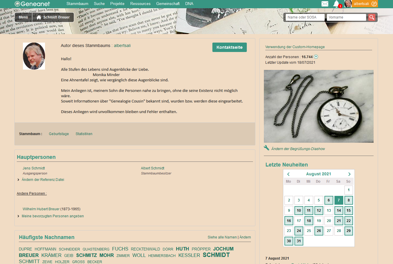 Beim Besuch dieser Seite erhält jeder " Besucherrecht " und kann eine begrenzte Zeit diesen Stammbaum erforschen. Aus Datenschutzgründen werden lebende Personen ohne Geburtsdaten und Personen unter 100 Jahren auch ohne Bilder gezeigt.